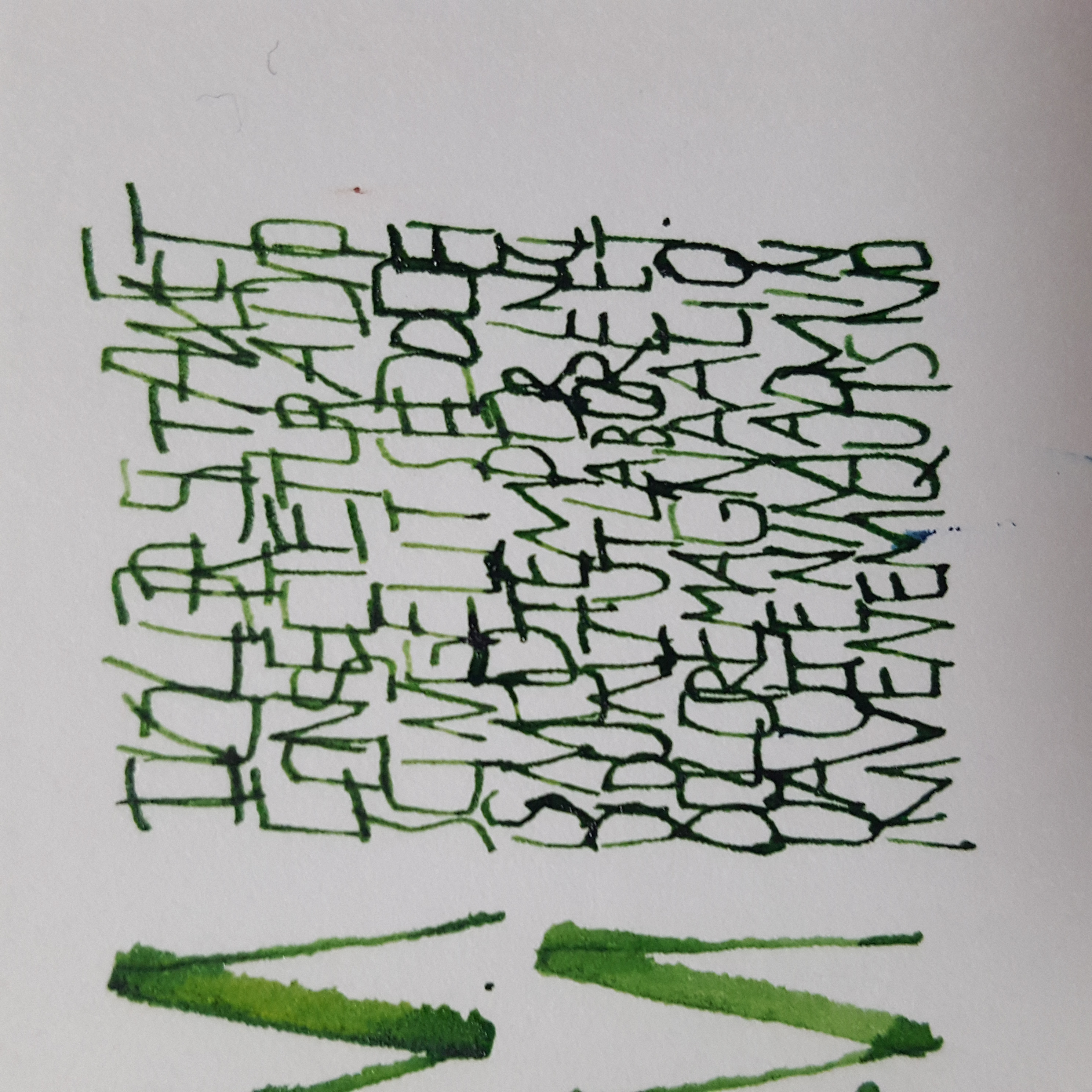 ↑Speedball のブロードニブ C-5 番で書いています。墨汁だから、当然書道用(毛筆用)に作られてるんでしょうが、適度なとろみのおかげでディップペンにも十分使えました。細い線も思いのまま表現できます。